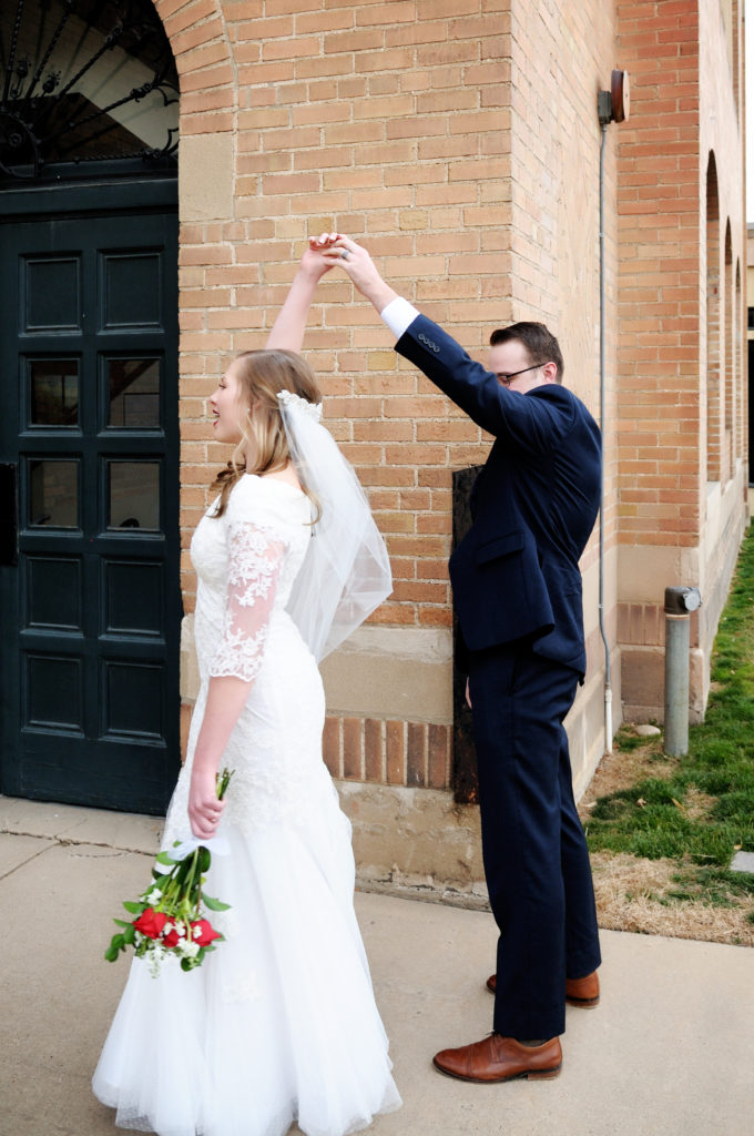 We loved Bri’s dress – it fit her so beautifully! Her roses in these pictures are not her bridal boquet; they were flowers that Ryker sent her for getting through finals week. Very sweet.